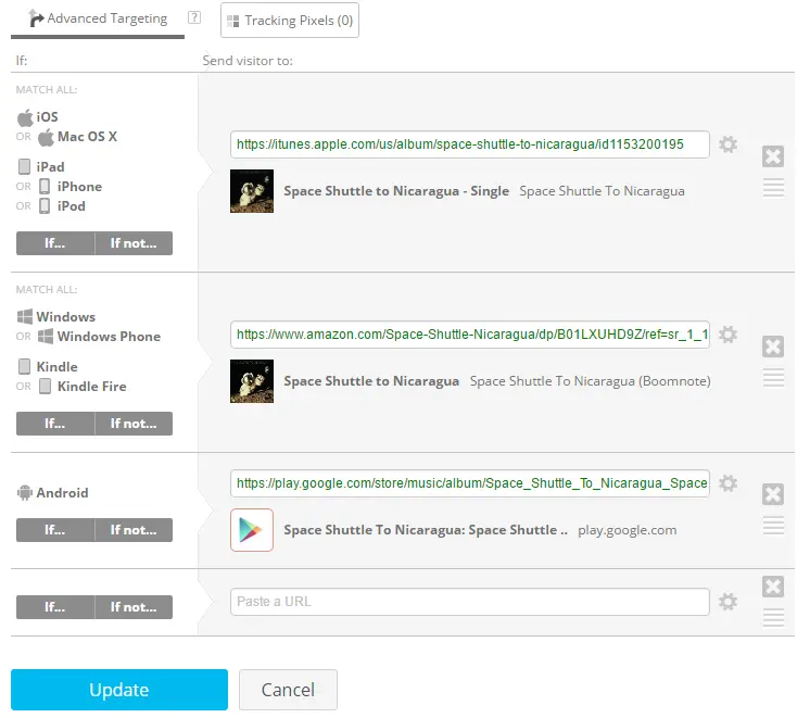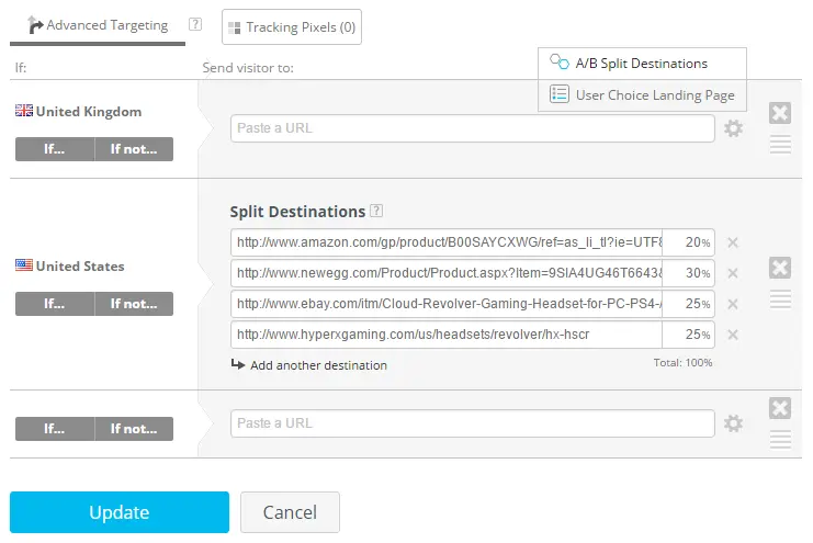 Edit your links to add advanced targets, pixels and change the default destination in real time, even after they're live, to avoid those headaches.